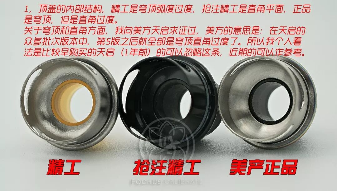 天启雾化器是非常复杂以及难辨认的一款雾化器(当然与普通精工对比是很简单),主要由于上面背景知识里所讲的,天启由于有杭州抢注天启(下文统称抢注精工)的存在,精工的还算比较像,在市场舆论上也将他们的产品作为正品在销售!另外一方面,正品天启前后有众多的批次,导致每个批次的正品天启版本都有细微的差别,而精工与抢注公司都是精工了正品某一个批次,也导致一些较为明显的点(如小设计差别)不能作为依据。最后一个小小的点,由于本人资源有限,与美方也仅仅购买了他们的不锈钢底座的天启雾化器,所以三个版本的天启雾化器精工都为不锈钢镀金底座,稍有遗憾。