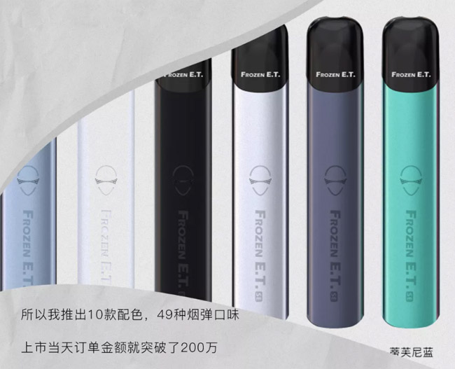 今天,我的第一款冰冻外星人Frozen E.T.4.0“漾”系列,在IECIE上海展会正式发布了“漾”系列作为一款入门级设备,需要提供更多的选择,所以我推出10款配色,49种烟弹口味。上市当天订单金额就突破了200万。(传送门:Frozen E.T. 4 SE冰冻外星人漾电子烟正式发布)