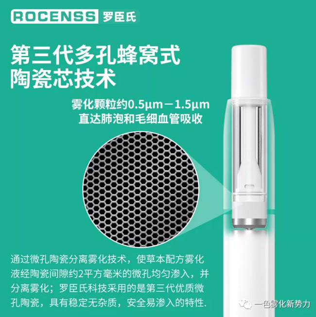 据了解,ROCENSS罗臣氏雾化棒采用间隙直径为微米级的多孔蜂窝式陶瓷芯,通过微孔陶瓷分离雾化技术和全自动气流控制智能感应技术,让雾化液从约2平方毫米的油孔渗入,来保持稳定的耐高温和安全易导油特性。