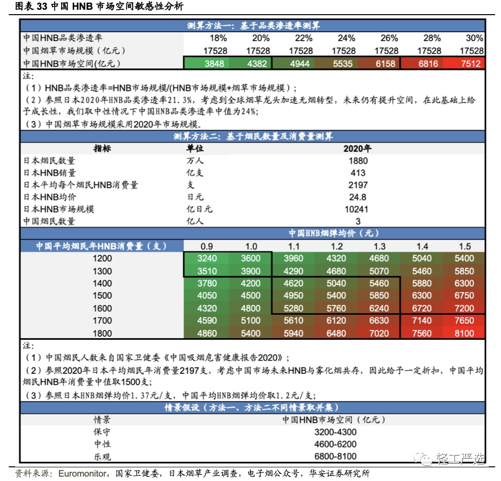 (1)方法一:一是基于日本2020年HNB品类渗透率提,对中国HNB市场空间进行敏感性分析,以2020年中国烟草市场规模为基准,参考日本2020年HNB品类渗透率21.3%同时给予一定的成长性,选取24%作为渗透率中值,在HNB品类渗透率位于18%至30%之间时,测算得到HNB市场规模位于3848亿元至7512亿元之间;