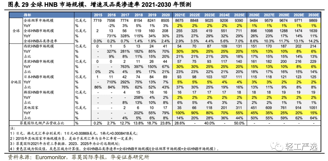 全球市场:2025、2030年HNB市场有望超700亿美元和1600亿美元。据欧睿数据,我们对2021-2030年全球HNB市场规模及品类渗透率进行预测。我们将全球市场分为几个主要地区,分别为西欧、东欧、日本、韩国和其他国家,根据每个地区的历史增速,并将假设的品类渗透率作为空间上限,倒推预测各地区未来增速,并由此估算出未来十年各地区市场规模,再由此得到未来十年全球HNB市场规模、增速及品类渗透率。经测算,我们估计2025年、2030年的全球HNB市场规模分别为711亿美元和1639亿美元,全球HNB品类渗透率分别为7.0%和14.2%,市场规模较2020年约有2.4、6.9倍的增长。