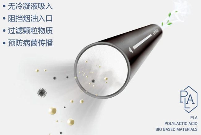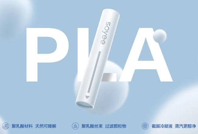 作为纯天然环保材料,PLA聚乳酸在人体内可经过酸或酶水解生成乳酸,最终产物为二氧化碳和水。具有良好的生物相容和生物可吸收性,对人体无毒、无害。此前PLA材料多用于包装、农业、餐具、医用和日用无纺材料等多个对入口安全有要求的领域,正是基于对消费者安全的研究方向,Soyee小叶前后历经两年,成功将PLA聚乳酸材料制成PLA滤材,并顺利应用于雾化领域,最终研发出全球首款PLA滤嘴式雾化器。