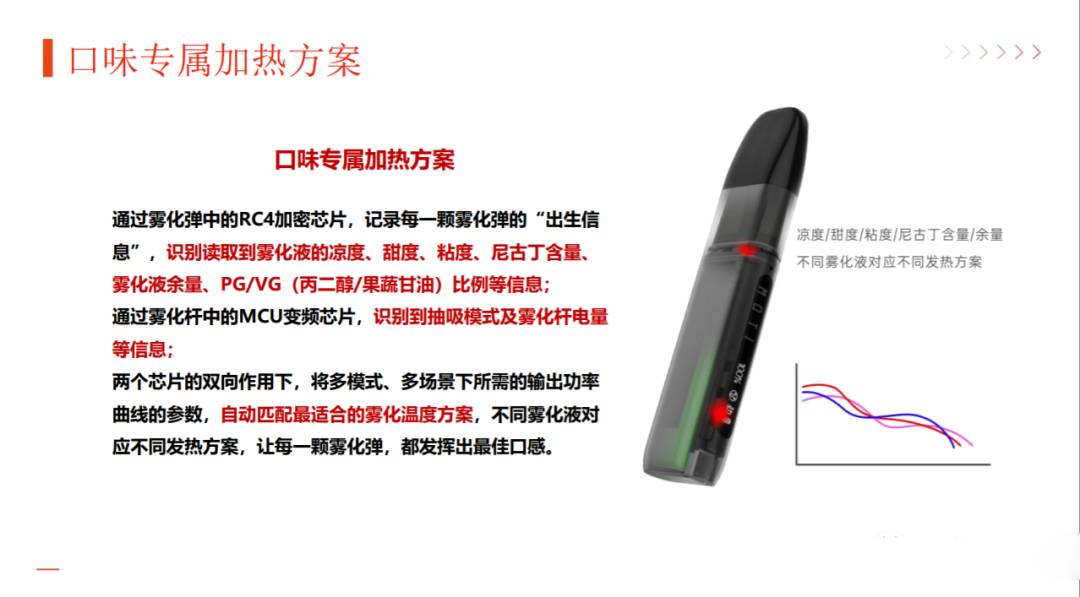 通过雾化弹中的RC4加密芯片,记录每一颗雾化弹的“出生信息”,识别读取到雾化液的凉度、甜度、粘度、尼古丁含量、雾化液余量、PG/VG (丙二醇/果蔬甘油)比例等信息;