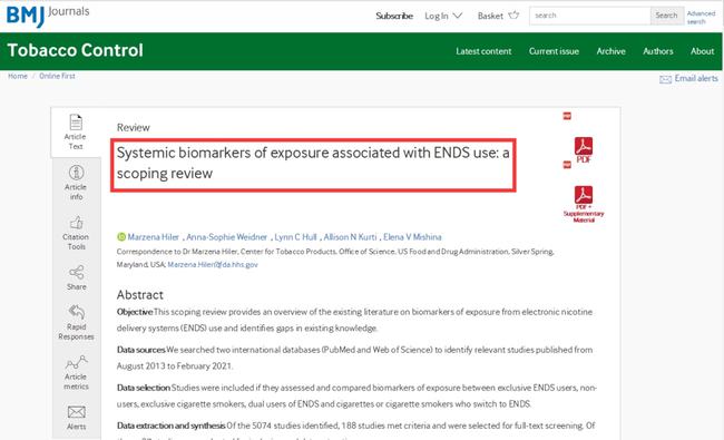 电子烟的减害性再次得到权威公共卫生机构证实。美国食品药品监督管理局(FDA)研究人员发布于期刊《烟草控制》的研究论文指出,电子烟比卷烟危害更小,烟民改用电子烟后,其尿液中多种致癌物的生物标志物水平会下降,最高可降95%。
