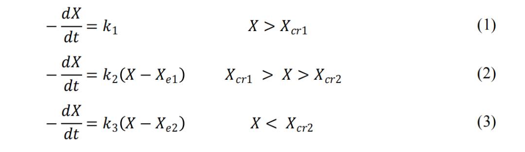 建立再造烟叶干燥动力学的分段模型如式(1-3)所示: