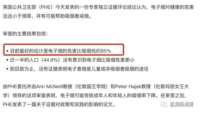 有研究表明电子烟的危害性比传统香烟低95%。
