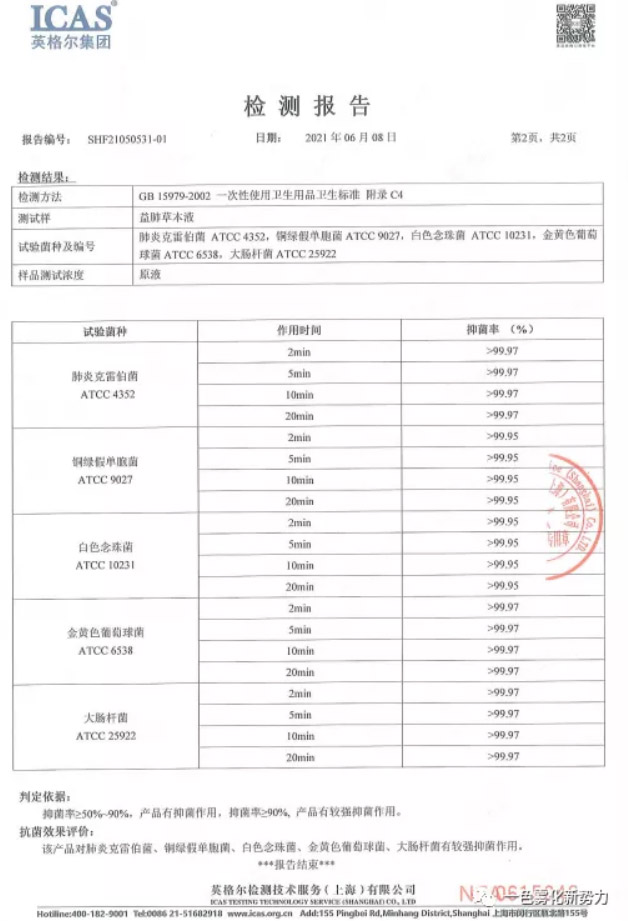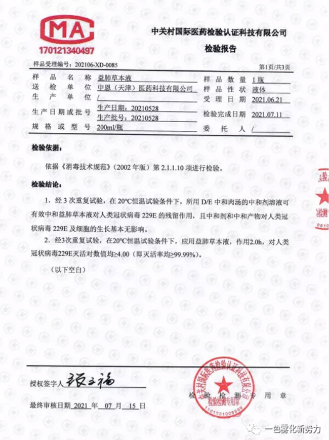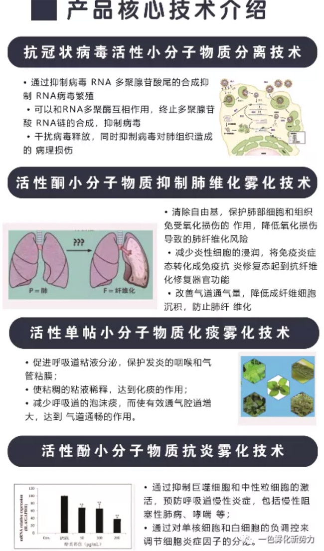 据悉,其特膳雾化产品“益菲雾化液”是由中国科学院博士后张颖团队研发的可吸入使用的药食同源功能性草本液,属于特殊膳食食品级,执行国标GB24154;可雾化为0.5微米小颗粒,直达肺泡,是吸烟人群养肺护肺首选;该产品无任何化学有害成分添加,吸入安全无毒;此外,“益菲雾化液”还具有抑菌、抗冠状病毒等功效,其中,抑菌率达 99 %以上,抗冠状病毒的国家技术专利目前已受理。