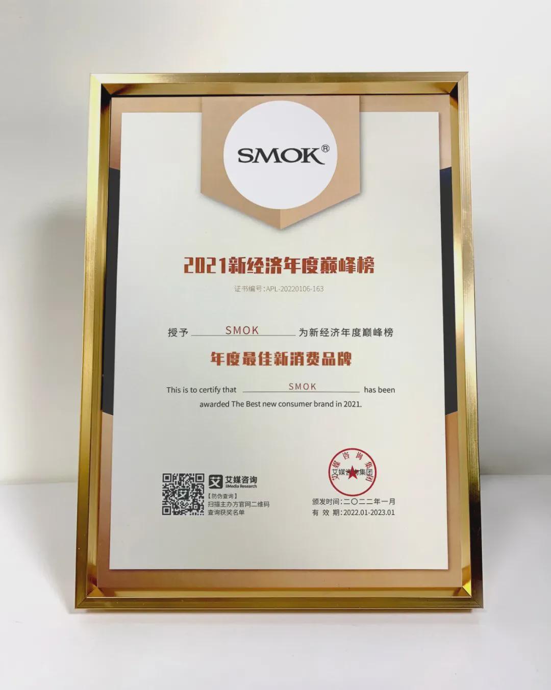 1月6日,由全球知名的新经济产业第三方数据挖掘和分析机构iiMedia Research(艾媒咨询)主办的“艾媒之夜·2022年新经济趋势分析大会”,正式揭晓了“2021新经济年度巅峰榜”获奖名单,SMOK凭借深耕行业的匠心精神与敢于创新的研发实力,在众多参评品牌中脱颖而出,荣获“2021年度最佳新消费品牌”奖。