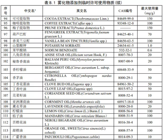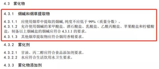 值得一提的是,烟草提取物并没有被包括在“白名单”中,而是与烟碱并列,单独作为雾化物原料提及。