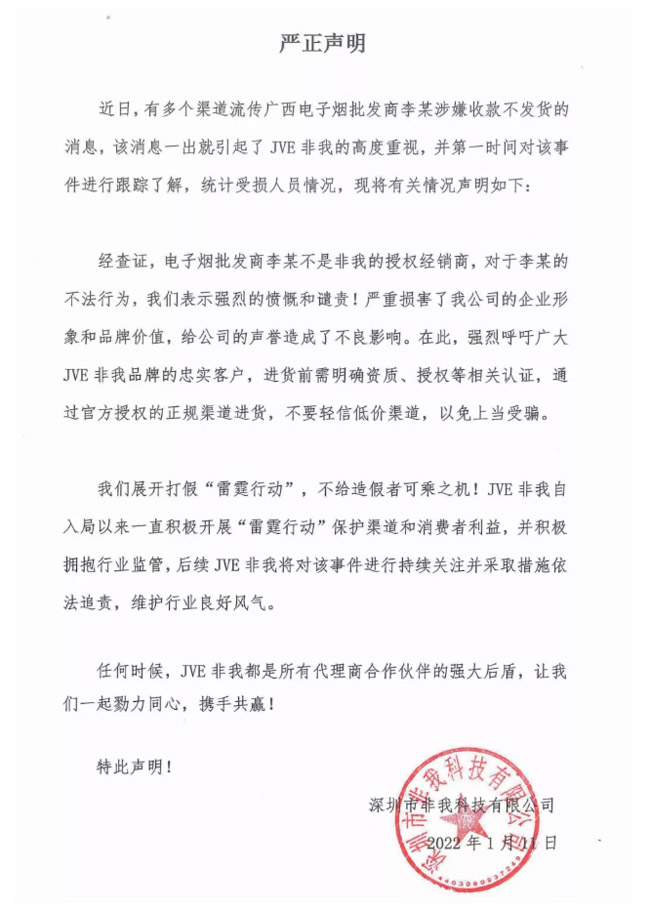 jve非我公司官方声明如下图所示: