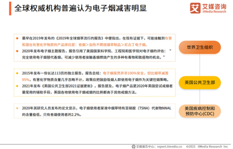 国外主流权威机构对电子烟进行了持续数年的评估,现阶段普遍认为电子烟的危害性远小于传统烟草,可作为吸烟人群的控烟戒烟策略。艾媒咨询分析师认为,随着国民健康观念的普及和电子烟市场的推广,电子烟的减害性将被烟民愈发了解并看重,戒烟减害成为主流声音。