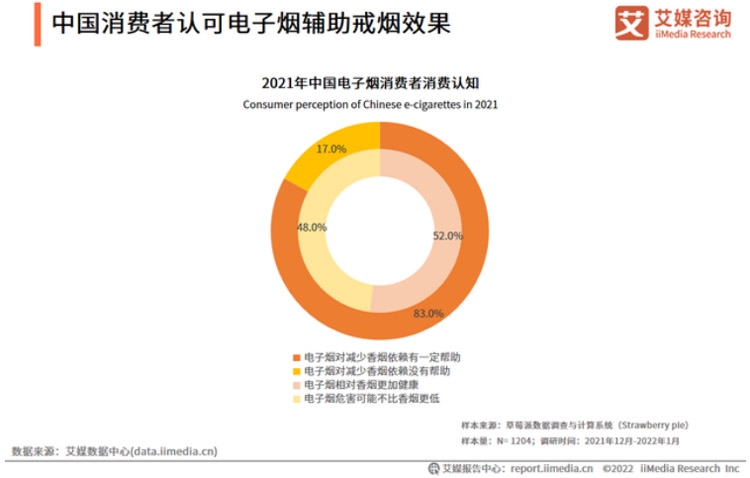 调研数据显示,中国电子烟消费者中83.0%认为电子烟对减少香烟依赖有一定帮助。52.0%消费者认为电子烟相对香烟更加健康。艾媒咨询分析师认为,消费者对于电子烟在替代香烟或减少香烟依赖方面有较为统一的认识,大部分人认可其积极效果,但在电子烟的危害性上还存在着较大的分歧,近半数消费者认为其危害和香烟可能是一样或更高的,这与国内电子烟行业发展不规范有关,企业生产经营各环节的资质不齐,无法保障烟民体验和健康。随着国家标准发布和监管逐步加强,电子烟产品的标准和认知将实现统一。