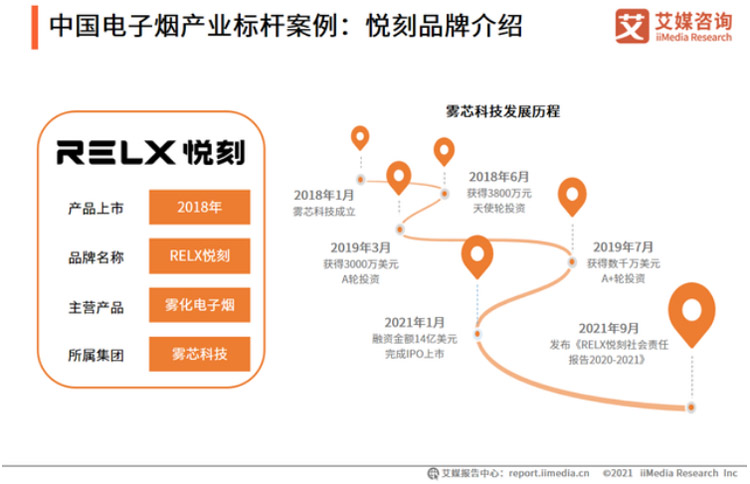 RELX悦刻成立于2018年,是国内消费级电子雾化器品牌,所属公司雾芯科技历经多轮融资发展,已完成纽交所上市。公司主营业务是电子雾化器的研发、设计和销售,通过线下渠道商和分销网络的扩大,目前悦刻已成为国内市占率和营收双第一的电子烟品牌。
