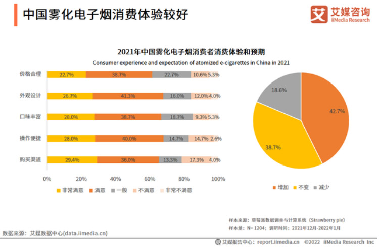 调研数据显示,中国雾化电子烟消费者对产品的价格、外观、口味、操作和购买渠道超六成表示满意或非常满意。42.7%的消费者表示将增加电子烟消费支出,仅18.7%消费者表示将减少相关支出。艾媒咨询分析师认为,消费者对雾化电子烟评分最低的是价格,雾化电子烟在国内仅是刚刚起步,商家相互间竞争还不激烈,随着未来消费人群和商家数量的增长可能带来价格的进一步降低。