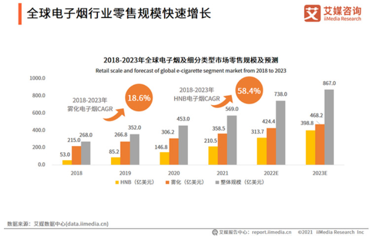 数据显示, 全球电子烟零售规模保持增长,2020年全球电子烟零售规模达到453亿美元,预计2023年全球电子烟零售规模将达867亿美元。全球雾化电子烟行业零售规模2018-2021年复合增长率为18.6%,预计2022年零售规模达424.4亿美元。全球HNB行业零售规模在2018-2021年复合增长率为58.4%,预计2022年零售规模达313.7亿美元。