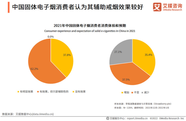 调研数据显示,中国固体电子烟消费者中37.8%认为其对戒烟有明显帮助,其余消费者认为其对戒烟有辅助效果。35.4%消费者表示将增加电子烟消费支出,27.1%消费者表示将减少相关支出。艾媒咨询分析师认为,固体电子烟产品口味更接近香烟,调研结果显示国内消费者普遍认为其对辅助戒烟有明显效果。