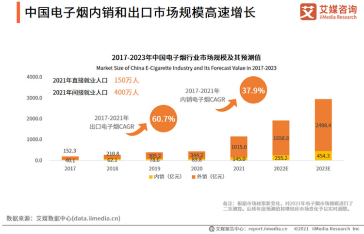 数据显示,中国电子烟行业内销市场规模持续增长,预计2022年增长率为76.0%,市场规模达255.2亿元。中国电子烟行业出口市场规模持续增长,预计2022年增长率为63.4%,市场规模达1658.8亿元。2021年中国电子烟产业直接就业人口约150万人,带动间接就业人口约400万人,总计约550万人。艾媒咨询分析师认为,预计在未来国内电子烟监管政策逐步完善的情况下, 电子烟产业能为国内经济效益和社会效益带来一定的促进意义。