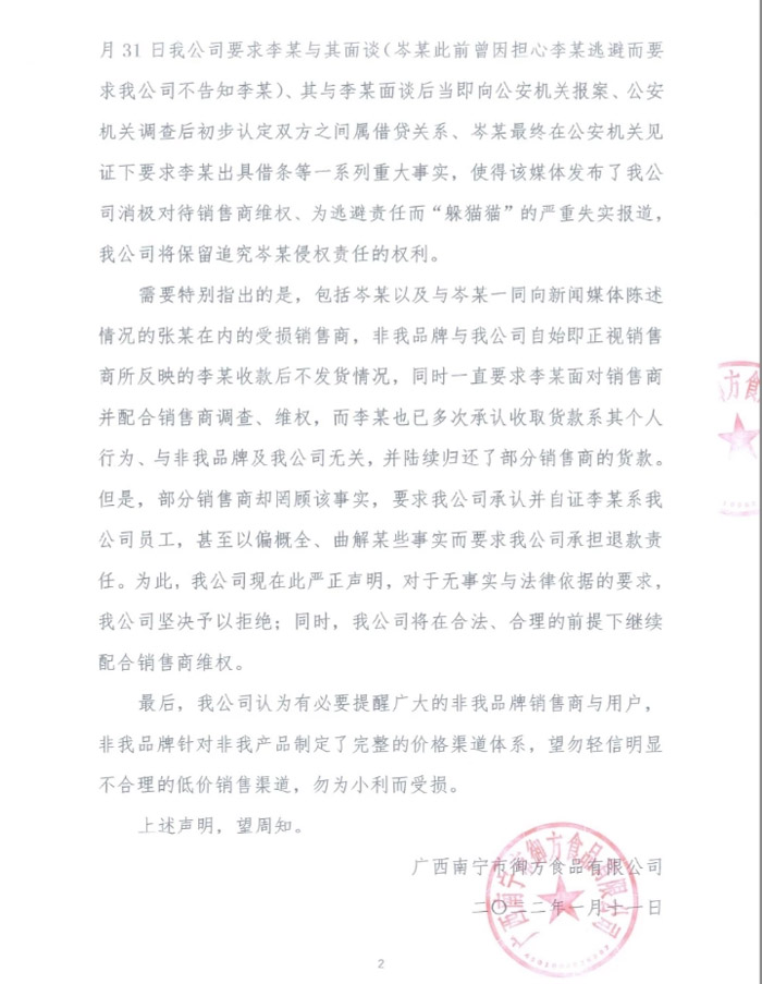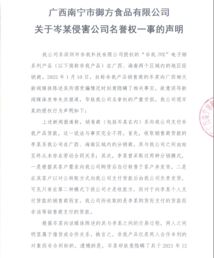 在李某收款不发货被报道后(传送门:被拖欠的80万货款何时能追回?),jve非我品牌方(传送门:JVE非我就广西电子烟批发商李某涉嫌收款不发货发表严正声明)和非我广西总代先后发布相关声明。
