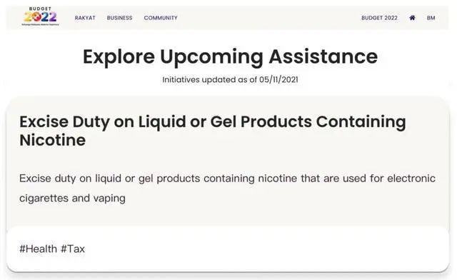 同年10月,马来西亚财政部长Tengku Zafrul Aziz在提交2022年预算时称,政府计划对电子烟征收消费税,这被看作马来西亚解禁电子烟的重要信号。