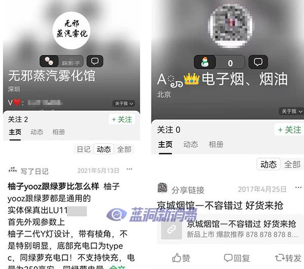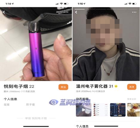 同时,记者在探探、虎扑、豆瓣等多个社交平台上都找到了电子烟销售的相关信息,均在个人主页上明确暗示有电子烟销售。