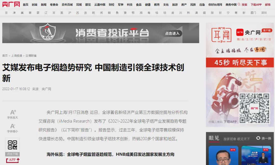 央广网上海1月17日消息 近日,全球著名新经济产业第三方数据挖掘与分析机构艾媒咨询(iiMedia Research)发布了《2021-2022年全球电子烟产业发展趋势专题研究报告》(以下简称“报告”)。报告显示,过去三年,全球电子烟零售规模保持快速增长态势。中国制造引领全球电子烟技术创新,热销200多个国家和地区。