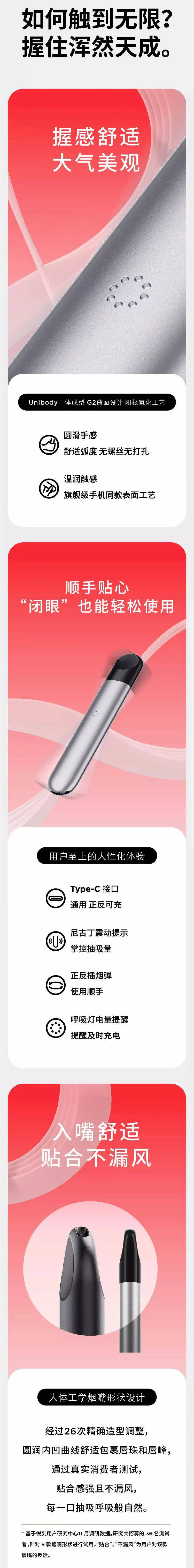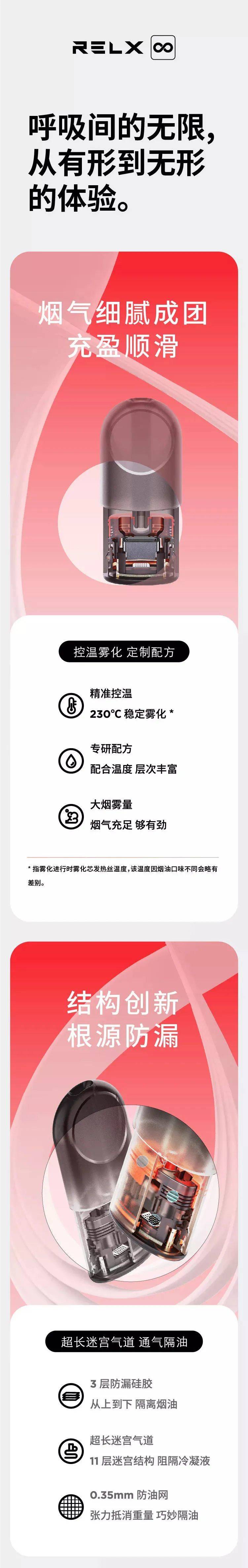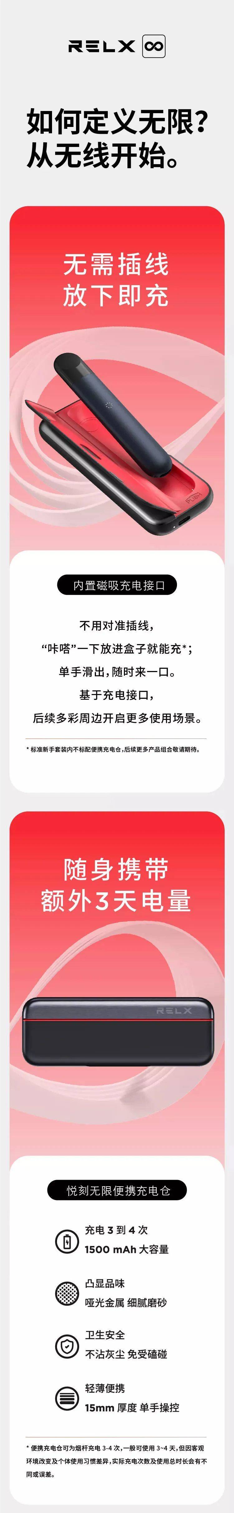 实际上,悦刻无限主要的定位是一代的升级款,首先补足了一代的缺点,升级了防漏油,号称史上悦刻最强防漏油!这是主打的卖点之一。然后就是增加了支持无线充电功能,电子烟的体型不大,注定了不能长久使用,因此一个无线充电盒来增加额外几天的用量,显得很实用,这实际上也是对之前客户反馈电量受限的一个回应!充电45分钟,使用24小时的界限被延长了几倍!