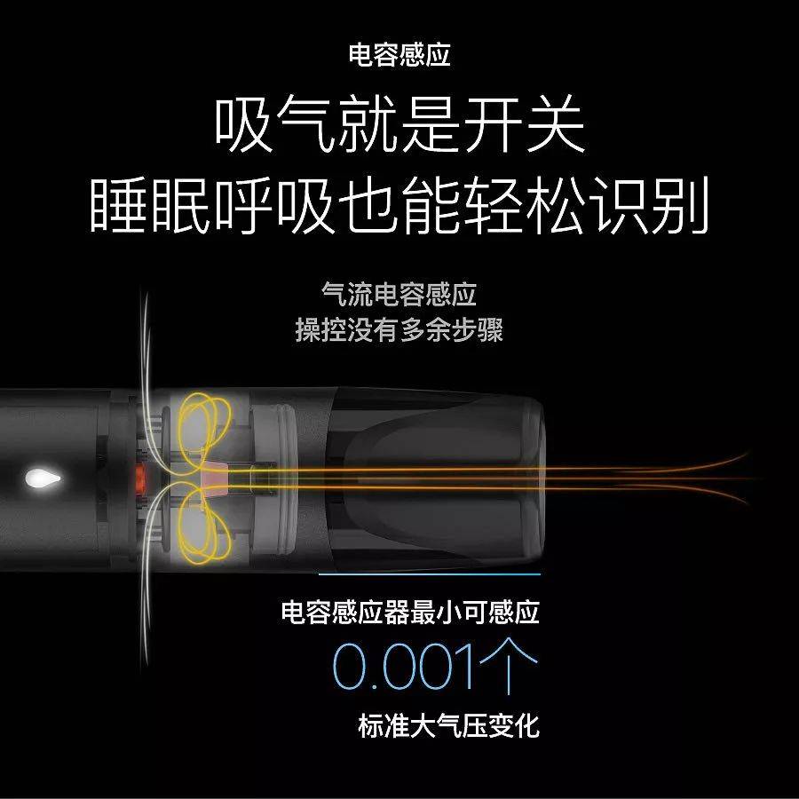 极度敏感的电容感应,可以感应到0.001个标准大气压变化,因此吸气就是开关,睡眠呼吸也能轻松识别,简易操控没有任何多余的步骤,轻松上手。