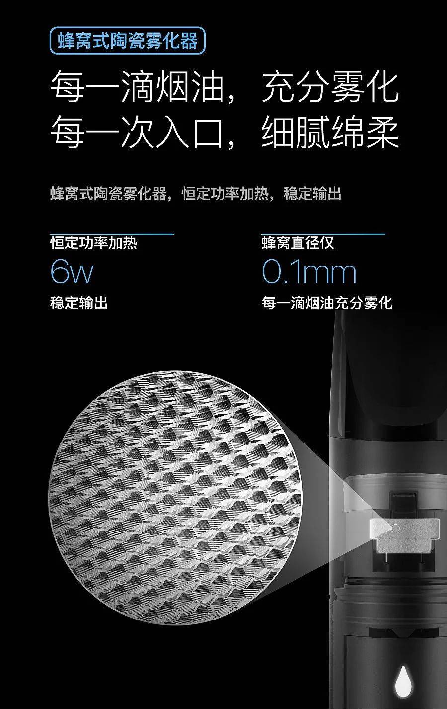 这里是悦刻一代的核心部分,蜂窝式陶瓷雾化器。蜂窝式陶瓷雾化器,恒定功率加热,稳定输出,确保每一滴油,充分雾化,每一次入口,都能细腻绵柔。