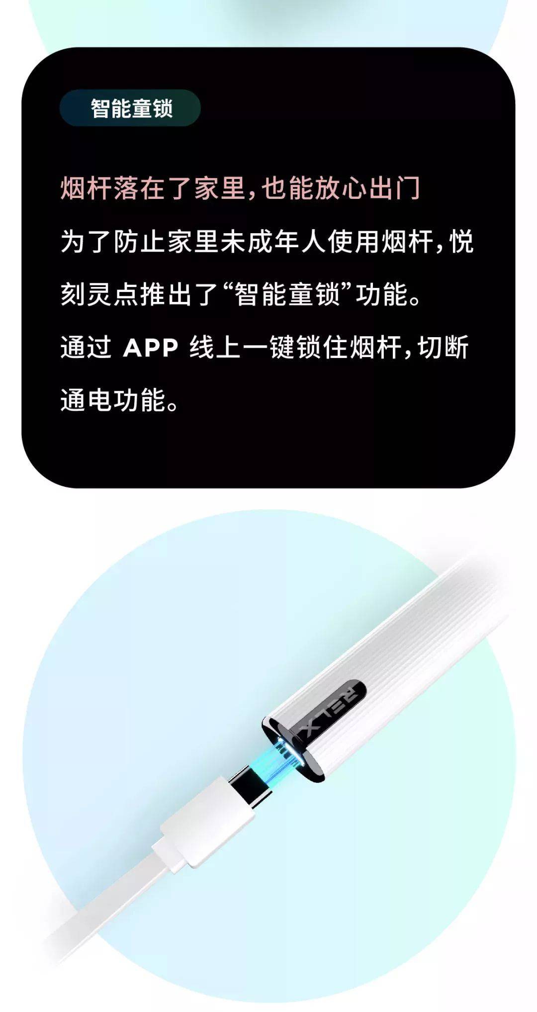 最后再说一下RELX悦刻的非常贴心的智能童锁设计,如果烟杆拉在家里了,可以锁住烟机,防止未成年使用!绝对的良心细节设置啊!
