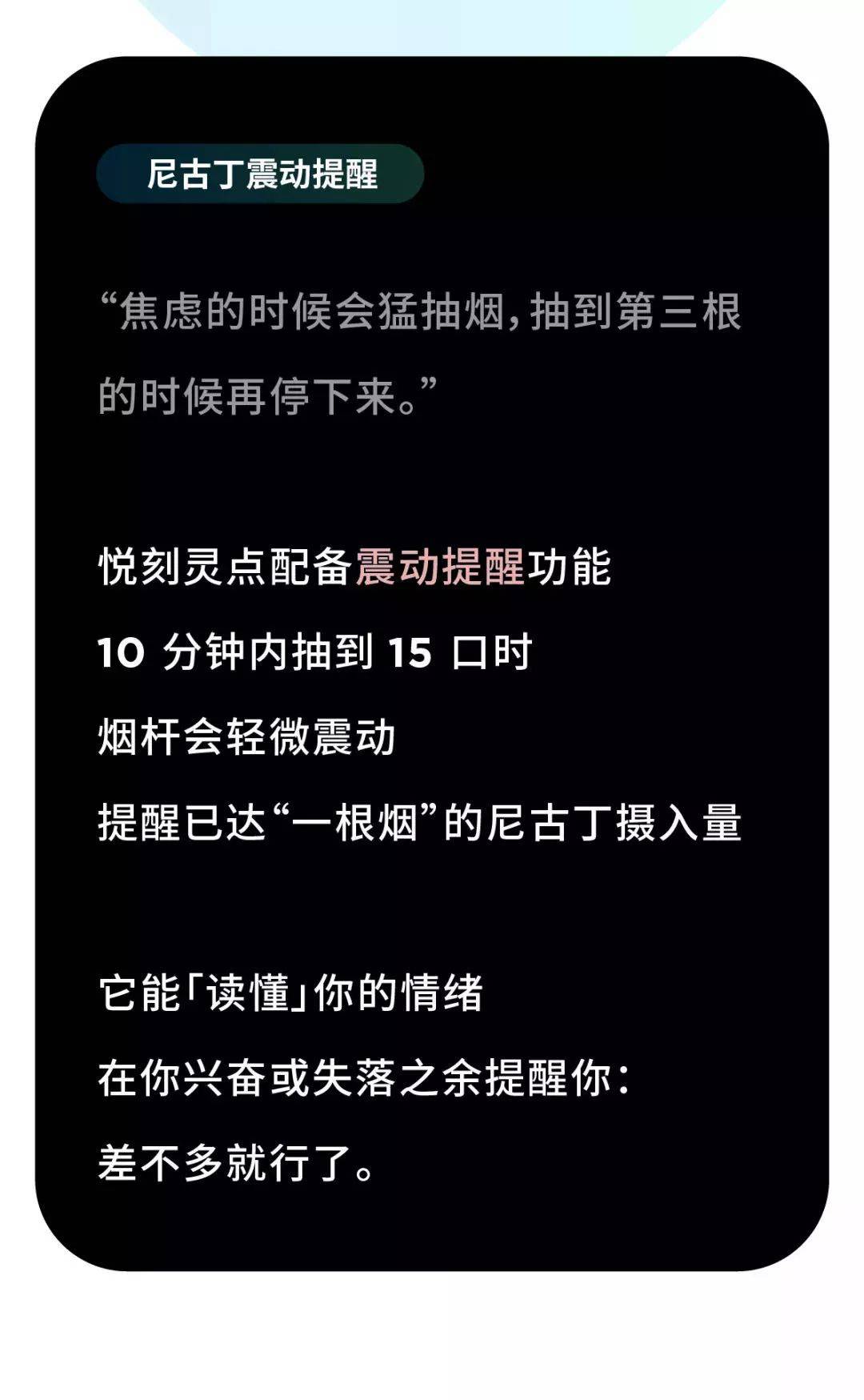 从这两点上也可以看出,悦刻研发团队对于电子烟戒烟功能愈发重视,应该是考虑到电子烟购买者大部分都有戒烟需求,瞄准了这部分受众,估计今后再出新品,数据监测功能和尼古丁震动提醒功能也都会是标配。