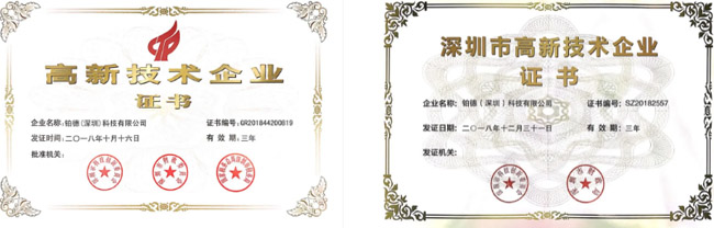 铂德早在2018年就已经获得深圳市高新技术企业认定,本次获得“国家高新技术企业”认定,代表了政府主管部门对铂德科研持续创新工作的高度认可,更彰显了公司的科研实力和竞争优势。这一荣誉将进一步提升公司品牌的知名度和美誉度,助力业务市场拓展。