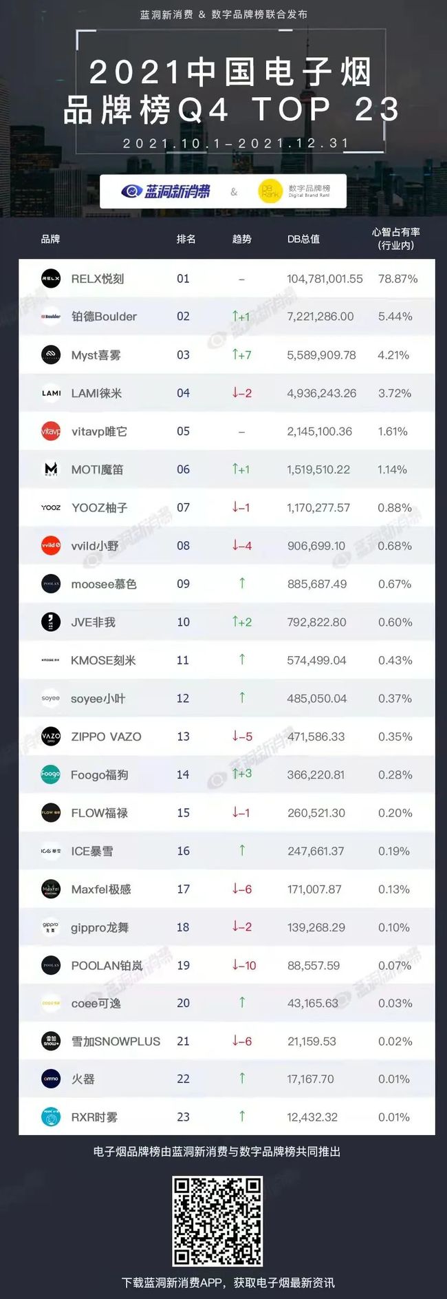 1月26日消息,电子雾化新媒体蓝洞新消费(BlueHole)与品牌口碑大数据研究机构数字品牌榜(DBRank)今日联合发布了中国电子烟第四季度品牌心智占有率排行榜,本项榜单为2021年第四季度榜单。