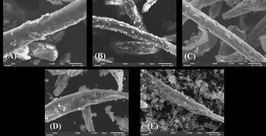 图4 不同氧气浓度下再造烟叶固相残余物的表面微观结构