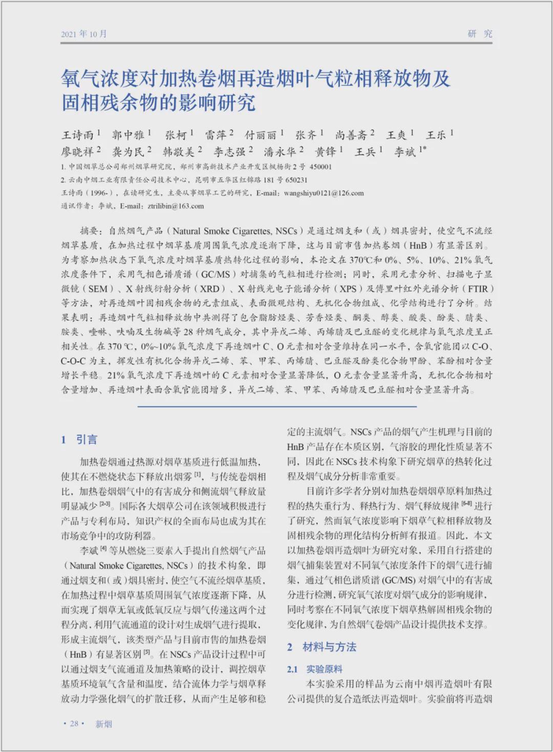 相关工作以《氧气浓度对加热卷烟再造烟叶气粒相释放物及固相残余物的影响研究》为题,发表于《新烟》杂志第4期(2021年10月)。