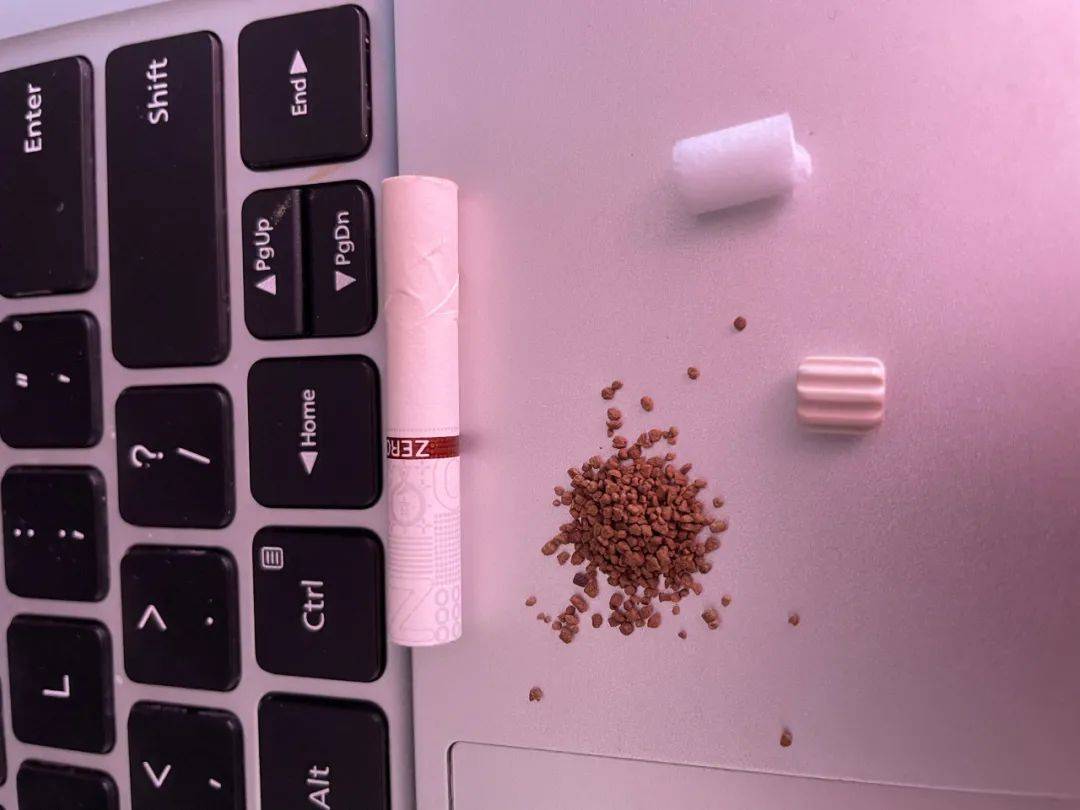 我们可以看到烟弹的组成本草颗粒+过滤颗粒器+海绵过滤嘴。极大的过滤有害物质和其他杂质。