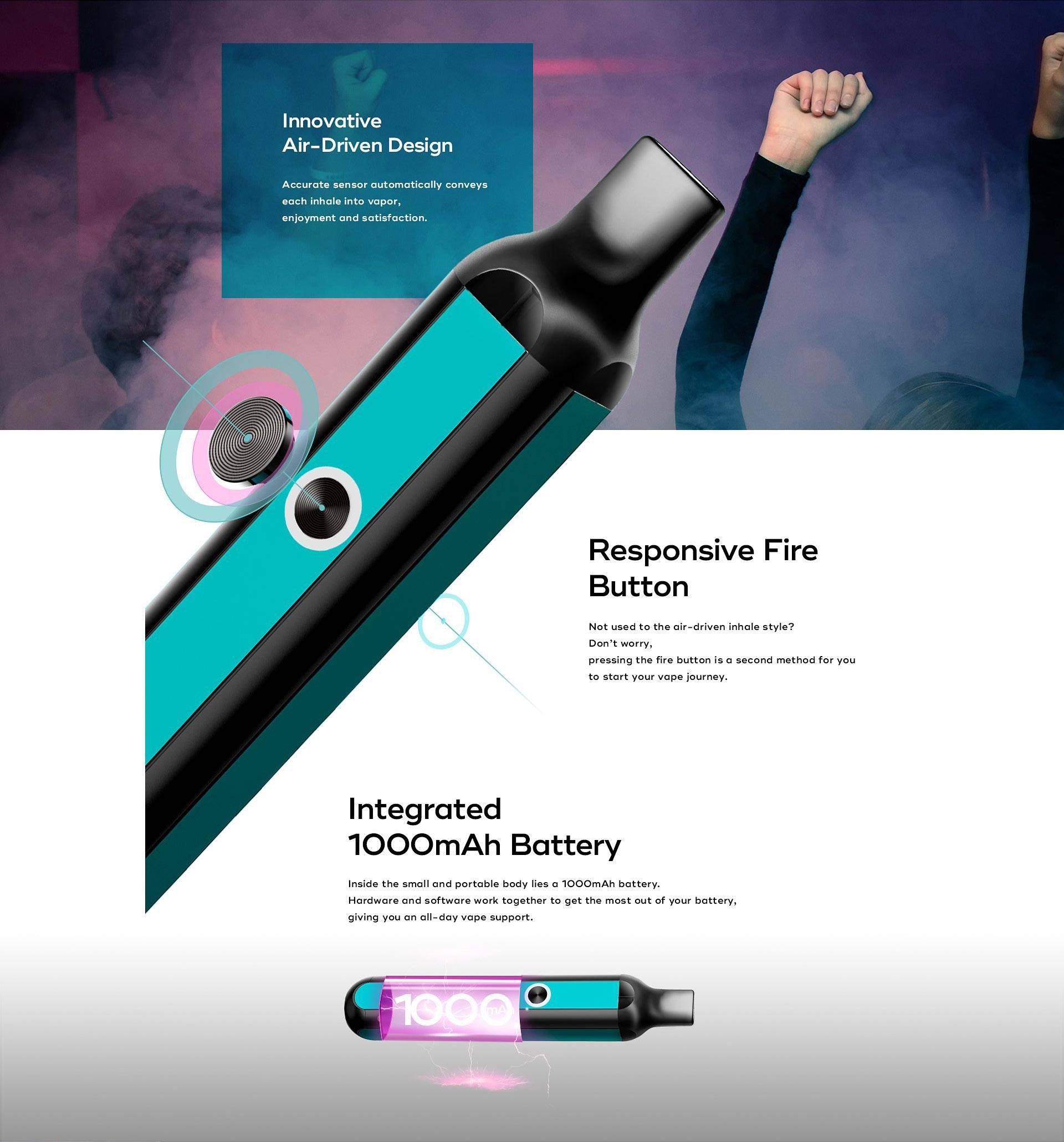 「OMARI-O Slyeek 斯莱克」有两种击发设备的方式:气动击发和按钮击发,内部的感应晶片可以精准的进行雾化。