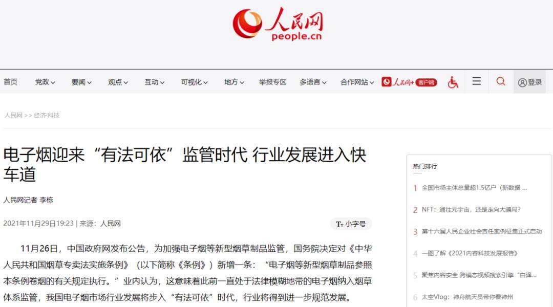 11月26日,中国政府网发布公告,为加强电子烟等新型烟草制品监管,国务院决定对《中华人民共和国烟草专卖法实施条例》(以下简称《条例》)新增一条:“电子烟等新型烟草制品参照本条例卷烟的有关规定执行。”