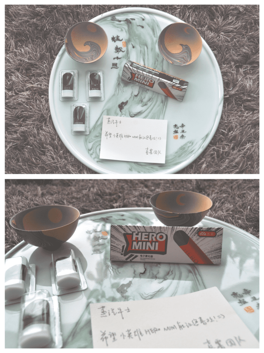 六边形的烟弹,底部数列两个进气孔,横向安排了两个镀金电极,设计的质感相当不错。1.0欧姆的电阻,1.9毫升的烟液容量,采用厚膜印刷陶瓷芯,雾化效果细腻绵柔。口味测评本次小老弟也是收到了三款口味的烟弹,分别为:淡定桂花铁观音、嘤桃炸弹、百香多鸭,我们来逐一体验一下它们的表现。淡定桂花铁观音:第一泡的铁观音茶,放凉了之后的既视感。很浓郁的茶香带着一丝清凉,茶多酚的那种苦涩感模拟的非常好,连抽几口,茶香也没有出现不稳的变化,这一点值得称赞。桂花的味道非常不明显,而且是出现在回甘中,希望后期可以略微改良=一下桂花的比重。百香多鸭:emmmmmm,听名字不难想到是百香果的味道,名字采用十二神兽,十二款动物定义的系列口味之一。迫不及待的抽上一口,百香果的酸甜立马充斥在口腔里,前调略酸,中调的香气还是相当浓郁的,这个尾调很有点意思,就是类似于啃柠檬皮的那种感觉,说不上来的怪异,但又不是那么的惹人烦,总之是一款非常规的百香果味,不走寻常路,一如其名嘤桃炸弹:极致的樱桃,没有之一。那种甜糯,那种清香,是真的做的很棒。你单纯的口嘬入喉,是品不出太多樱桃的味道来,但是当你把烟雾从鼻腔中回笼吸入,那种樱桃独有的香甜直接刺入你的鼻腔,相当真实的模拟感,老弟个人认为如果能再增加一点点甜度,堪称完美。品质感个性体验不得不承认喜雾这款HeroMini,它所带来的品质感并没有因为它是入门产品(烟杆零售价49元,且限时0元购)而有所降低。