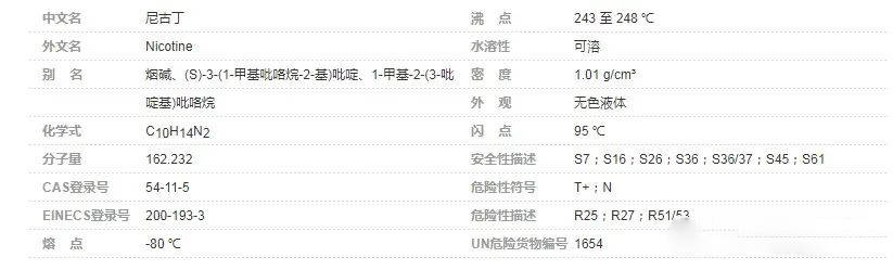 尼古丁(Nicotine),俗名烟碱,是一种有机化合物,化学式C10H14N2,有剧毒,是一种存在于茄科植物(茄属)中的生物碱,也是烟草的重要成分,还是N-胆碱受体激动药的代表,对N1和N2受体及中枢神经系统均有作用,无临床应用价值。尼古丁会使人上瘾或产生依赖性,重复使用尼古丁也增加心跳速率和升高血压并降低食欲。大剂量的尼古丁会引起呕吐以及恶心,严重时人会死亡。烟草中通常会含有尼古丁。电子烟也含有传统烟草的有害物质尼古丁。
