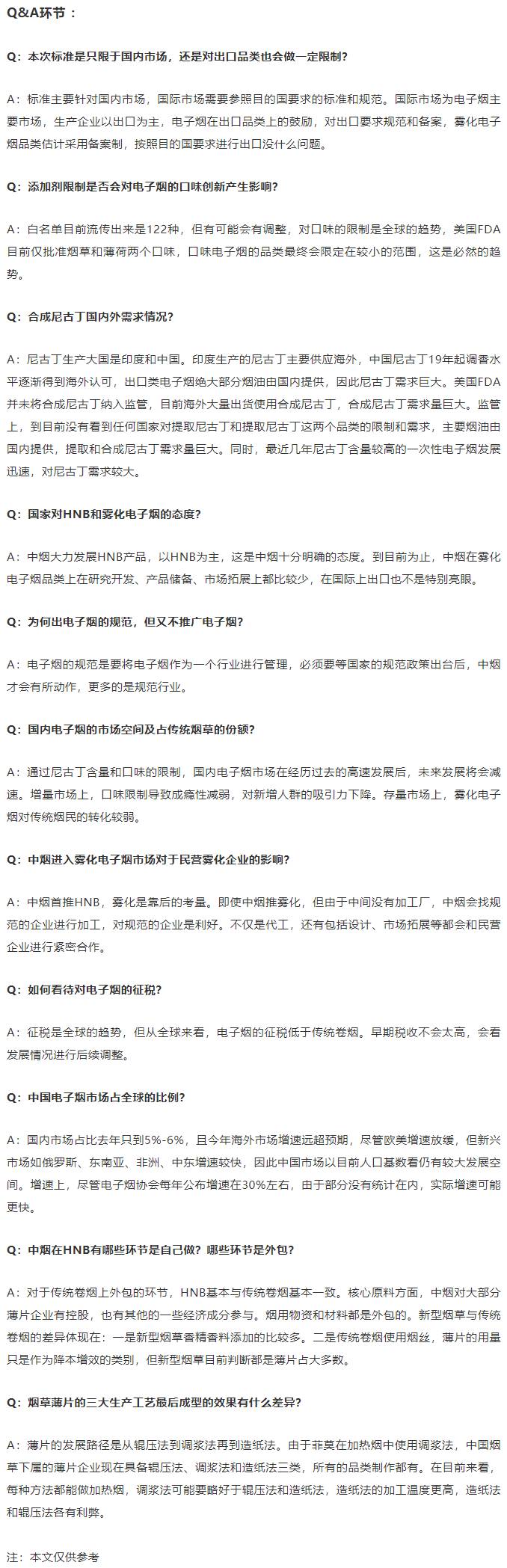 在标准草案征求意见之后,还会有上网公告、征求意见、专家审议和报批等一系列工作,较难在短时间落地。本次会议基本没有涉及销售、税收和企业认证办法。19年公告电子烟作为传统烟草的补充,合法身份确立,国内对电子烟的生产销售基本不会一刀切。国内电子烟主要以出口为主,今年出口量预计同比有明显增长。目前电子烟只是加强规范和管理,国际上很多原来禁止电子烟的国家和地区开始对电子烟品类进行重新审议,有些已经放开,有些还需要评估,可能也会放开,只有香港、台湾等地区基本禁止。