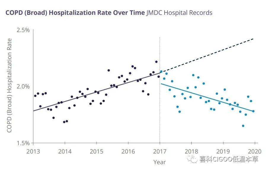 来自日本的民众相关疾病数据在日本的医疗数据库中,吸烟相关的慢阻肺病和缺血心脏病在加热不燃烧逐渐普及之后,日本大众中这两种疾病的患病人数明显减少。