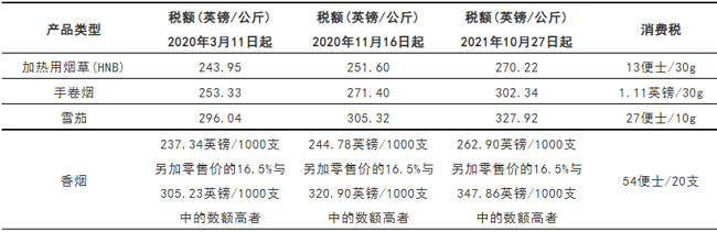 2021年10月27日,英国税务海关总署(HMRC)再次上调包括加热用烟草制品(HNB)在内的烟草制品税,这是近两年时间内的第三次上调。HMRC采取加大烟草制品税和终端消费税对消费者施加影响,进一步降低天然烟草制品的消费量,可能进而导致进口数量下滑对国内HNB生产企业造成影响。