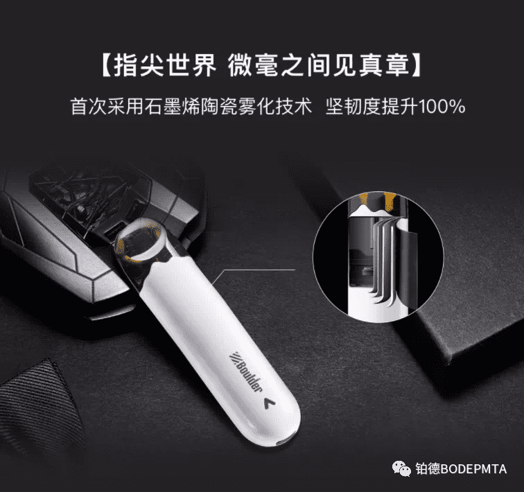 沿用家族式设计的基础上,新款琥珀在细节上颇下功夫。机身大小为101*25*13mm,相较于同类产品略大。针对这一问题,铂德在雾化弹接口处创新性采用“山形”设计,让一大部分雾化弹藏于雾化杆内部,从视觉上修饰了铂德机身过大的问题;同时,“山形”设计将品牌诞生地的地标同产品相结合,提升产品辨识度的同时,也将铂德“勇敢、无畏、开拓、征服”的“攀登”精神融入其中。