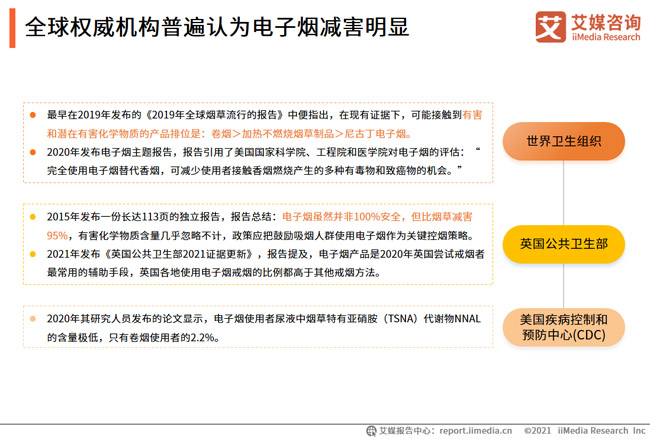 减害是烟草行业发展的核心诉求。国外主流卫生组织对电子烟进行了持续数年的评估,现阶段普遍认为电子烟的危害性远小于传统烟草。国外主流权威机构对电子烟进行了持续数年的评估,现阶段普遍认为电子烟的危害性远小于传统烟草,可作为吸烟人群的控烟戒烟策略。艾媒咨询分析师认为,随着国民健康观念的普及和电子烟市场的推广,电子烟的减害性将被烟民愈发了解并看重,戒烟减害成为主流声音。