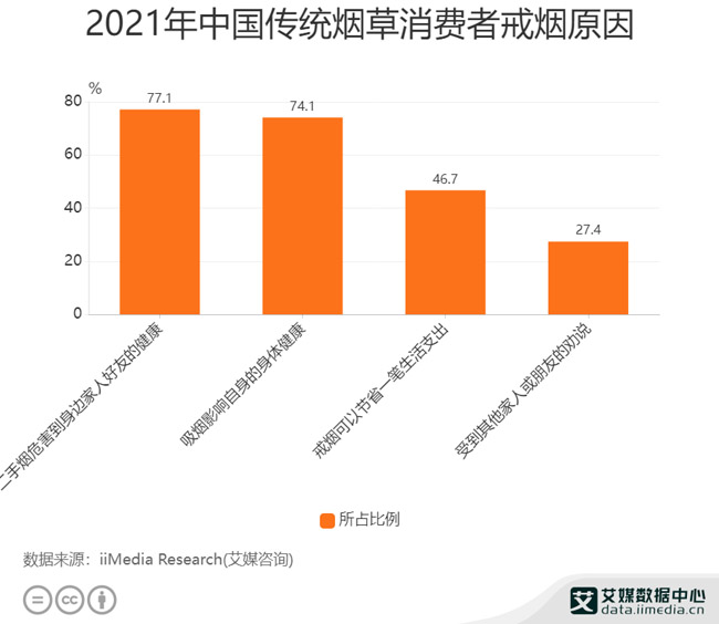 艾媒咨询数据显示,有近九成的烟草消费者有戒烟的想法,但仅2成左右成功戒烟。而消费者希望戒烟的最重要原因是担心危害到身边家人好友的健康(77.1%),其次是担心影响自己的健康(74.1%)。由此可见,我国烟草消费者对“二手烟”危害有一定了解, 吸烟有害健康的思想愈加深刻,戒除香烟已是国内传统烟草消费者迫切的需求,而从实际情况来看,戒烟情况不容乐观,电子烟作为新兴烟草业态能一定程度上吸收传统烟草消费者的需求。