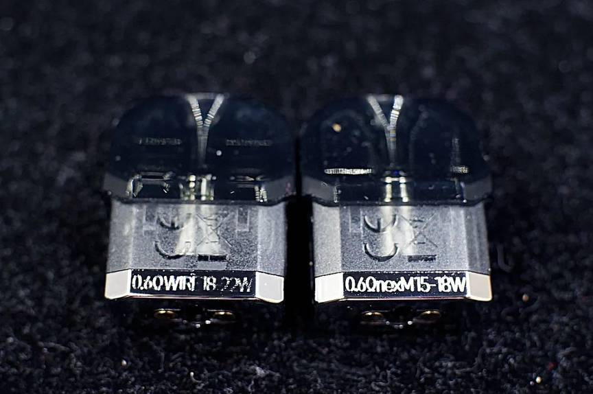 原厂提供的烟弹都是0.6Ω,区别是一个为WIRE的双丝并绕芯和nexM的网子芯,推荐功率都写在上面。按照这样的电阻来看盐油大部分来说就是无缘此产品,常规的3/6mg才是正常的选择。