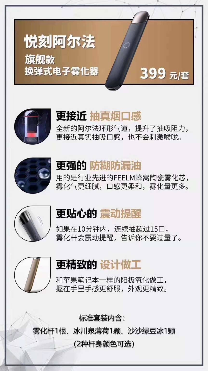 悦刻二代阿尔法 作为一代之后的新品,改进很多,从外观、使用体验尤其是烟弹上都做了很多突破,很多专利的技术是很大的进步,着实让人眼前一新,尤其商务风让很多商务人士有了更好的选择,受面群众年龄层更广。