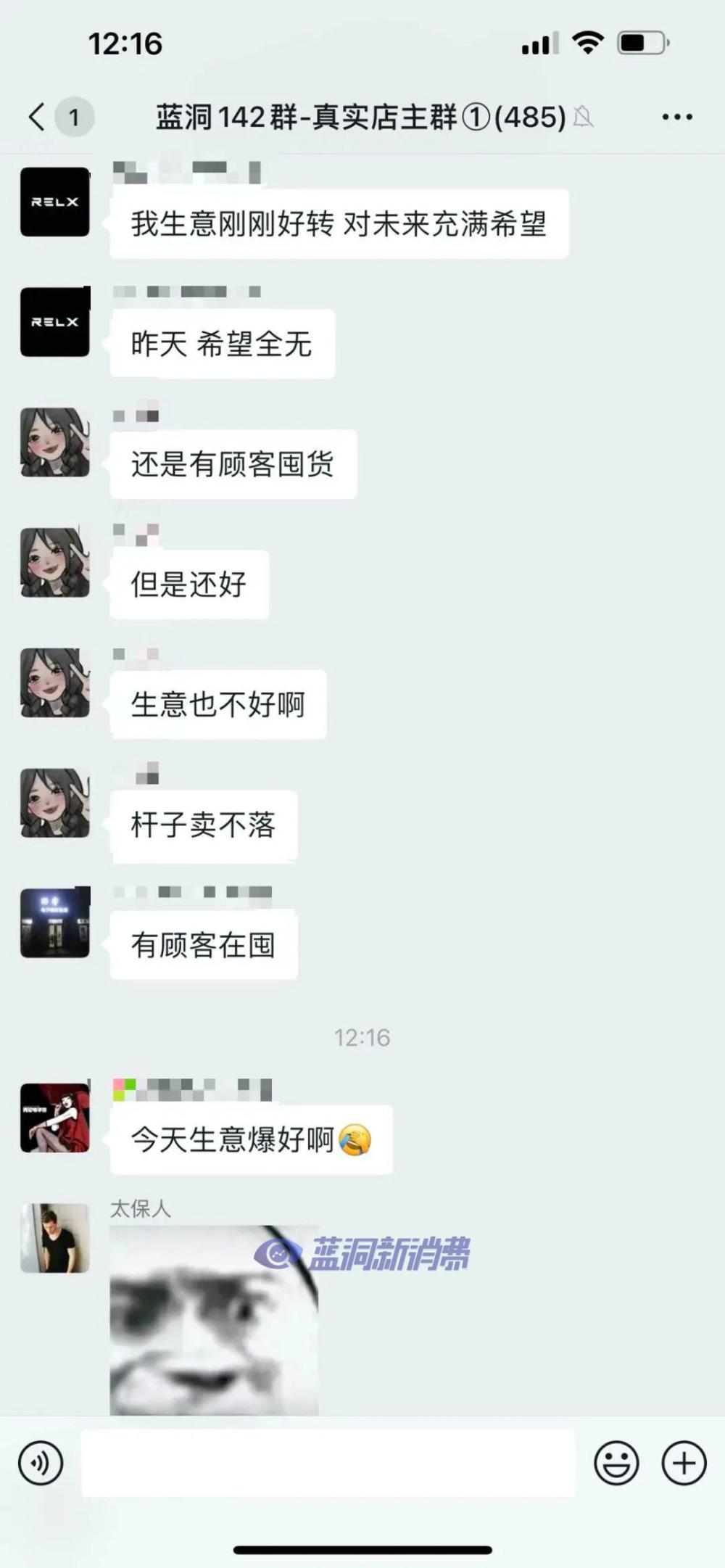 蓝洞截取了部分用户囤货现象的截图,可谓是十分魔幻。昨天还在守着7尺柜台打着王者,今天的营业额就冲到了王者,昨夜梦里梦见有个100盒的大单,今天就有大佬微信转账了。