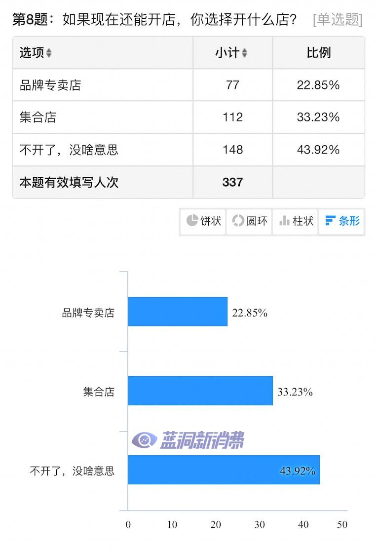 调查显示,如果在过渡期还能开店的话,22.9%选择开品牌专卖店,22.2%的人选择开集合店,此外43.9%的人选择躺平不开了。