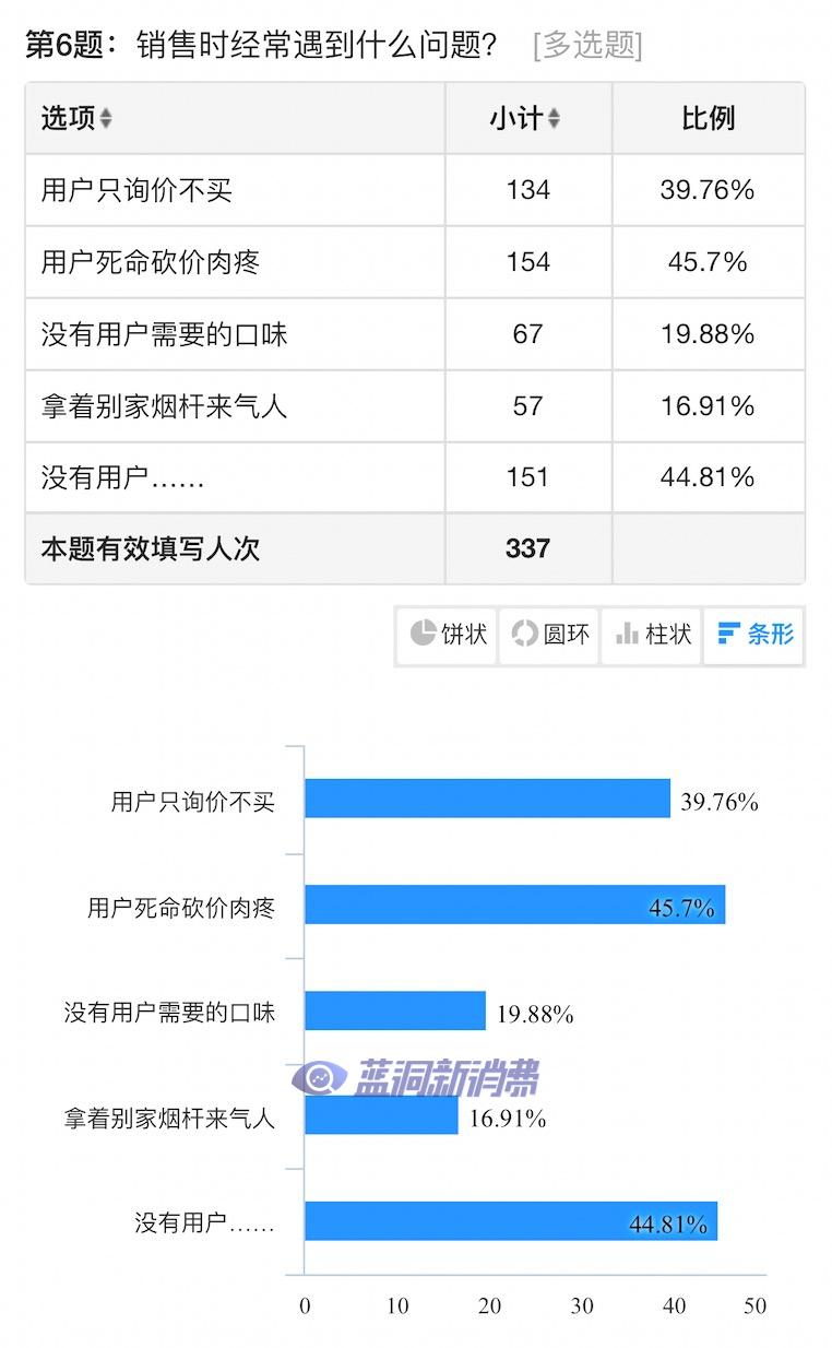 调查显示,日常遇到最大的问题是没有用户,占比44.8%,用户死命砍价占到了45.7%,只询价不买比例也有39.8%,缺少口味占比19.9%,此外还有16.9%的用户拿着别家烟杆来买烟弹。